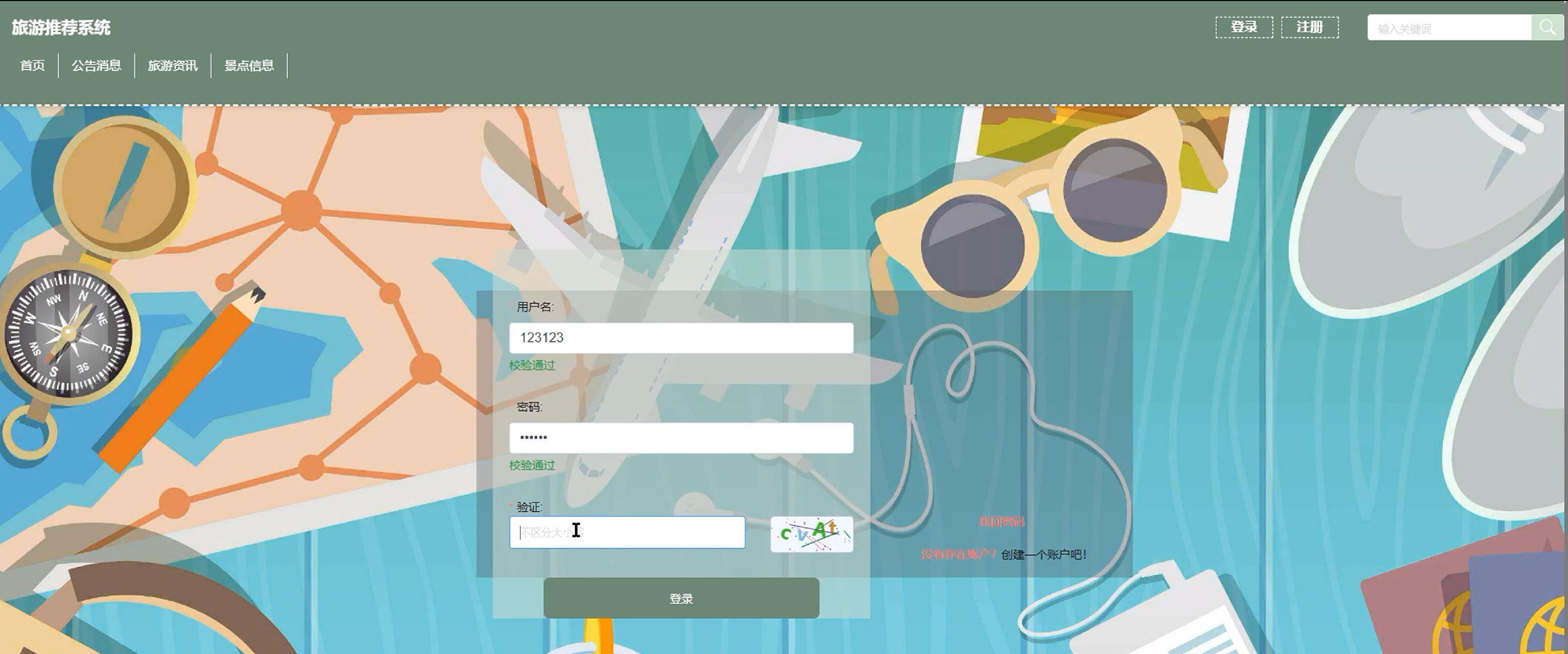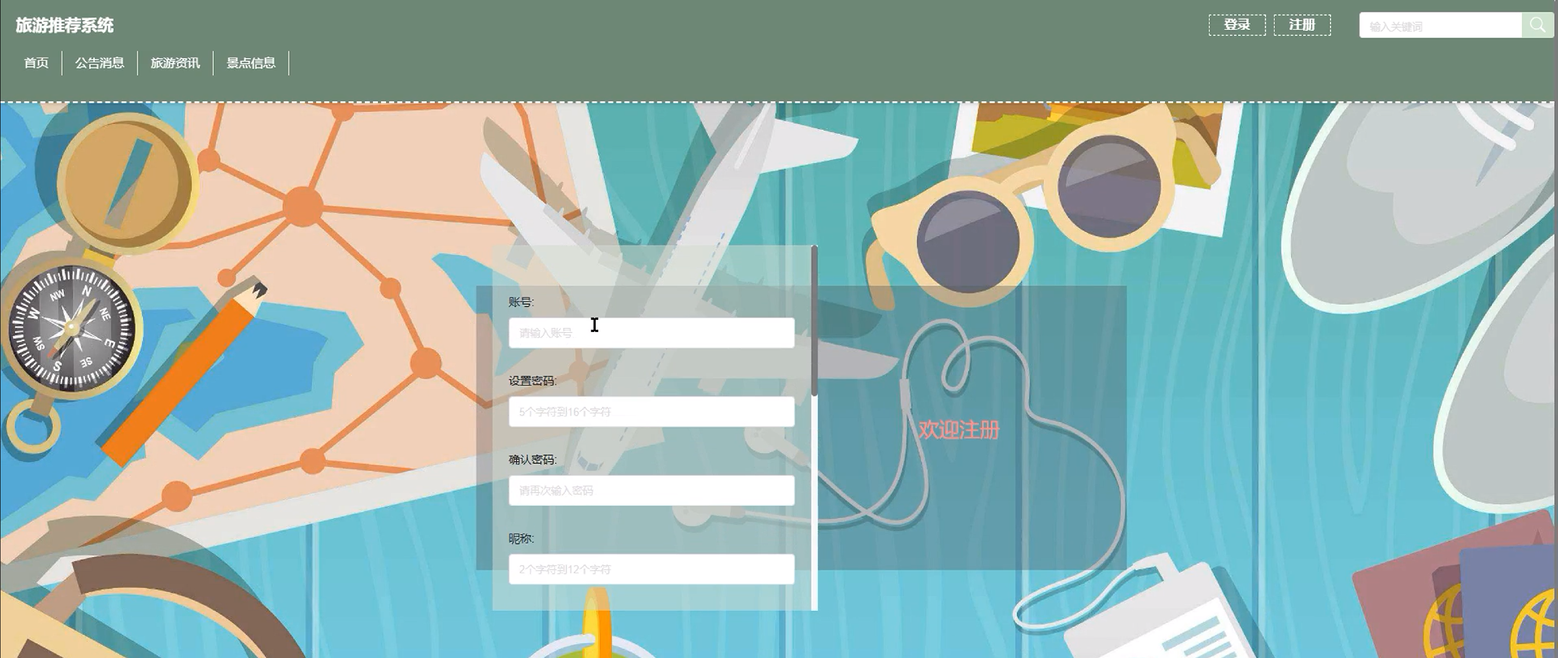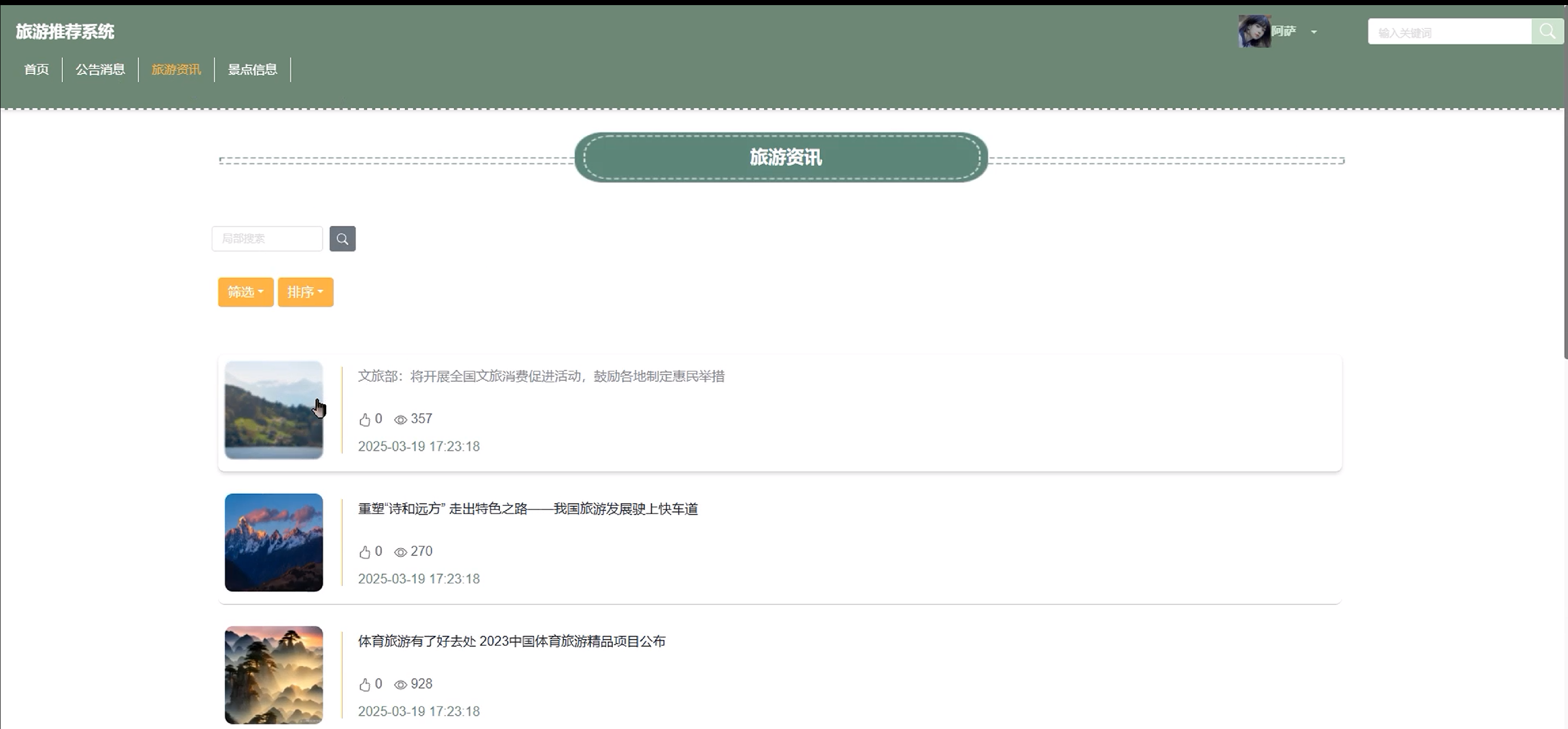 (2)首页:用户进入旅游推荐系统的时候,首先映入眼帘的是系统的首页、公告消息、旅游资讯、景点信息等信息。