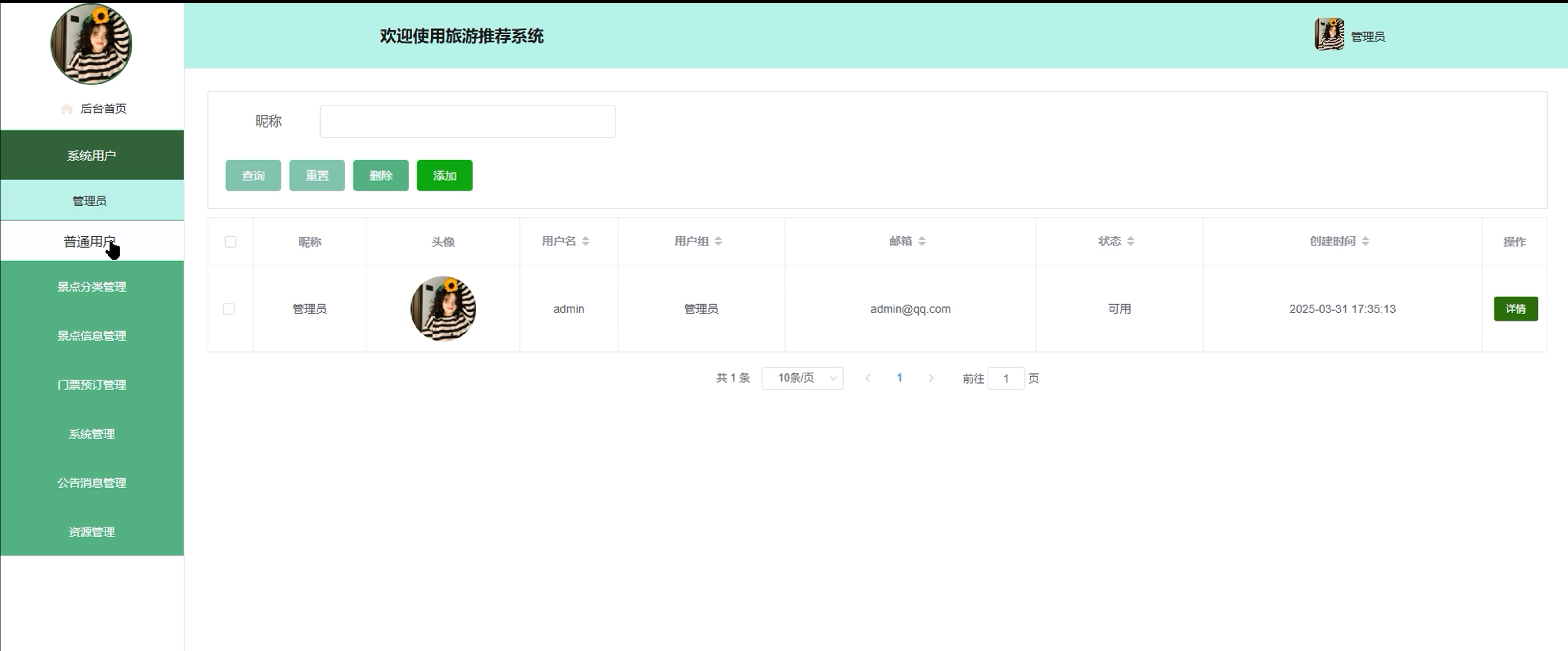 (2)系统用户:管理员点击可查看系统用户(管理员、普通用户)列表中某个用户的详情,可以对用户信息进行查询、审核、添加和删除操作。