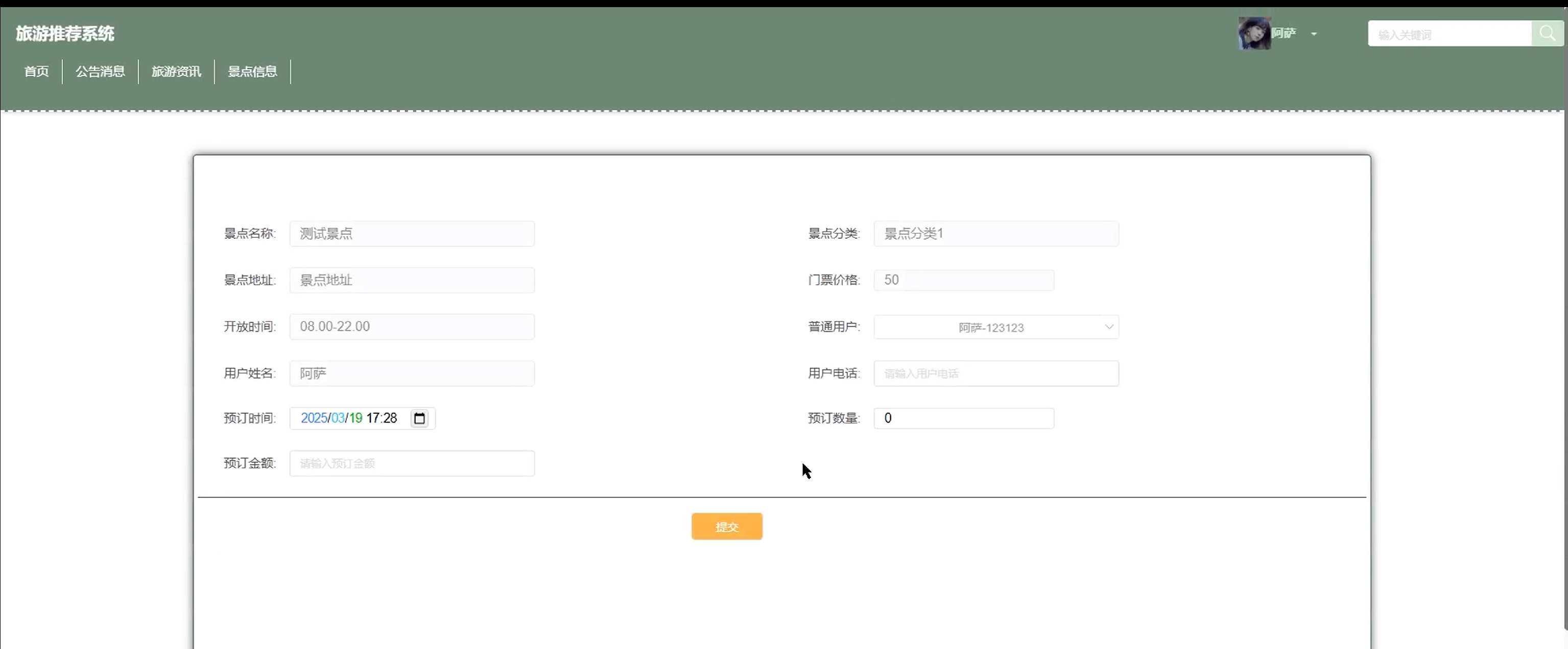 (5)景点信息:用户点击可通过搜索景点名称、景点分类进行查看景点信息列表。点击进入想要了解的景点可查看详情信息,可进行点赞、收藏和评论。点击“预订”按钮可添加预订信息,包括预订时间、预订数量和预订金额。(景点名称、景点分类、景点地址、门票价格、开放时间、普通用户、用户姓名、用户电话、预订时间、预订数量和预订金额)