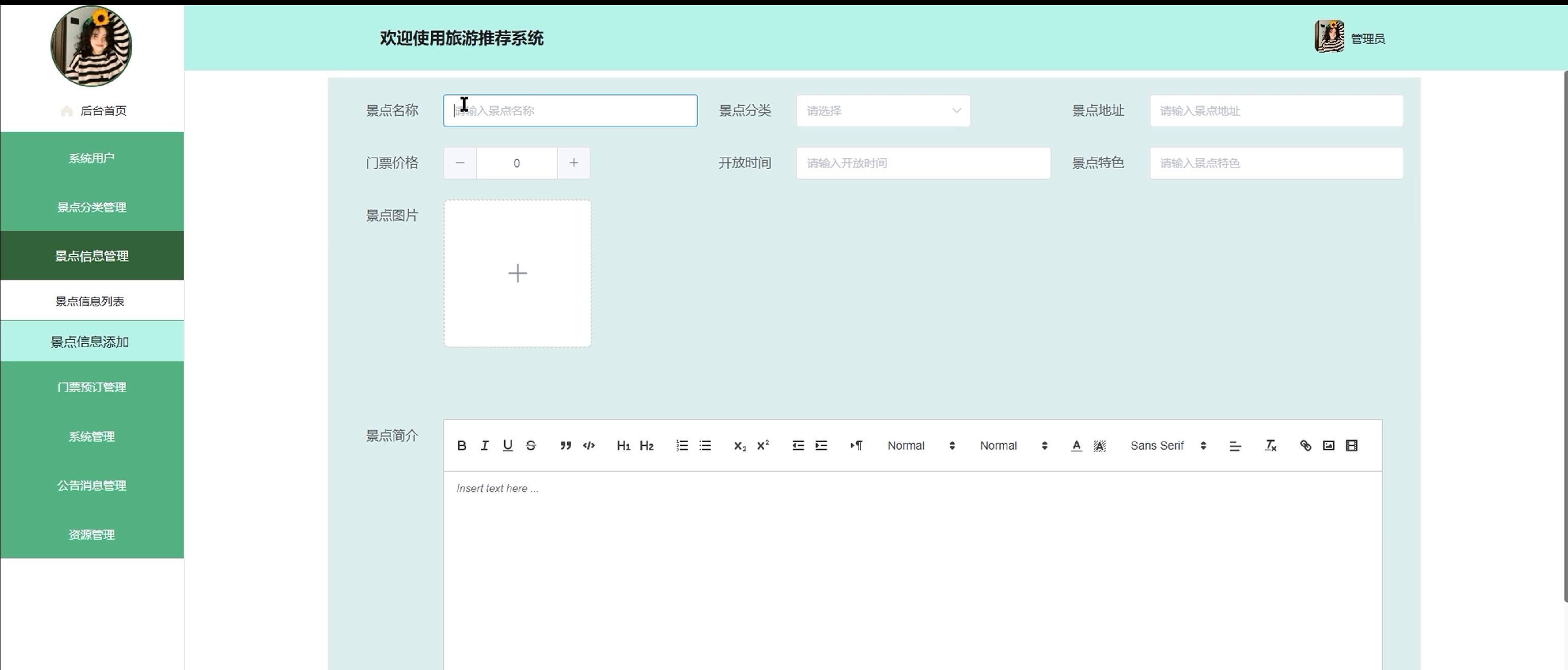 (4)景点信息管理:管理员点击可查看景点信息列表和景点信息添加;点击进入“景点信息添加”可填写相关信息,包括景点名称、景点分类、景点地址、门票价格、开放时间、景点特色、景点图片和景点简介。