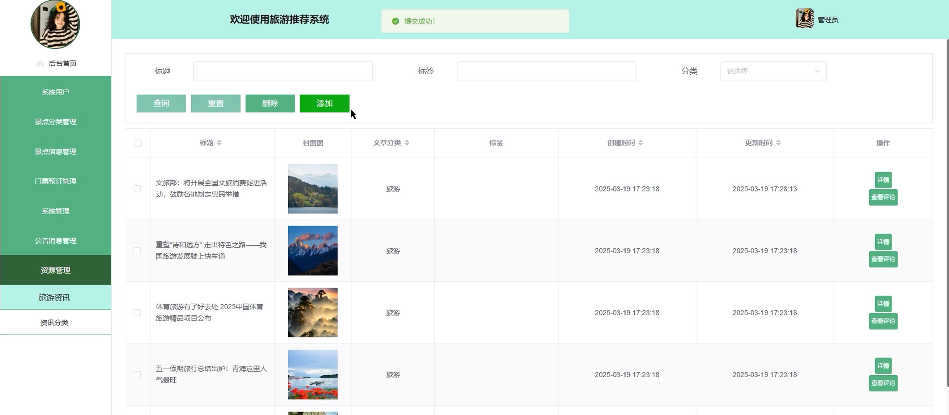 (8)资源管理:管理员点击可查旅游资讯和资讯分类;如需添加新的资讯,点击“添加”按钮,上传封面图,输入标题,选择分类,输入标签、描述和正文,点击“确认”按钮进行添加。同时可对资讯和分类进行增删改查。