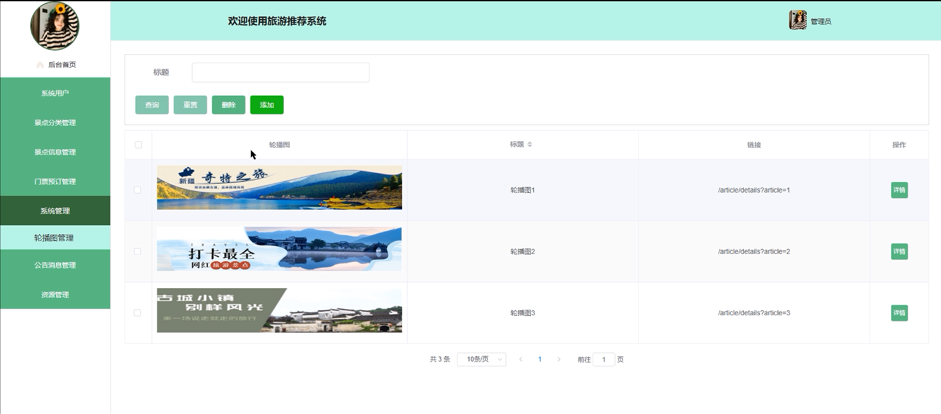 (6)系统管理:管理员点击可查看轮播图管理;如需添加新的轮播图,点击右侧“添加”按钮,上传图片,输入标题和链接,点击“确认””按钮进行添加;同时可对轮播图进行增删改查。