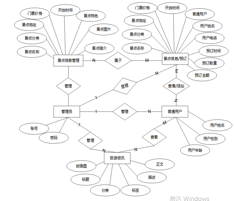 借助先进的系统,E-R图使其他用户可以快速轻松地了解系统的功能以及他们之间的关系。根据旅游推荐系统分析结果,本旅游推荐系统总体E-R图如下图所示。