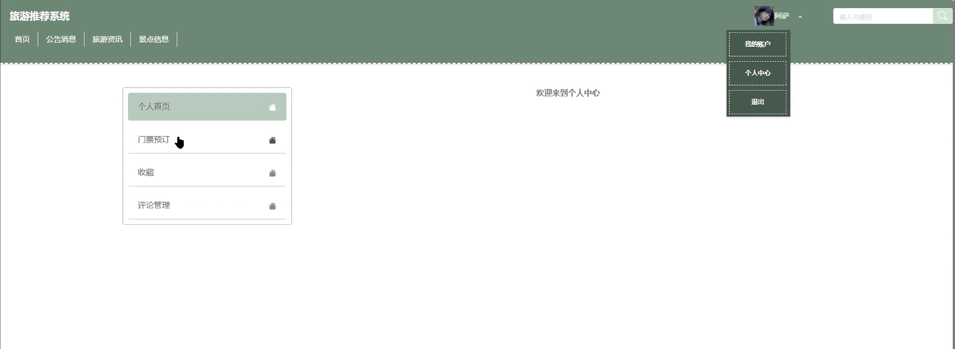 (7)个人中心:个人中心包含多个功能模块,如个人首页、门票预订、收藏和评论管理。点击进入门票预订可查看预订信息并进行支付。同时可查看历史收藏信息和评论信息,也可进行删除。