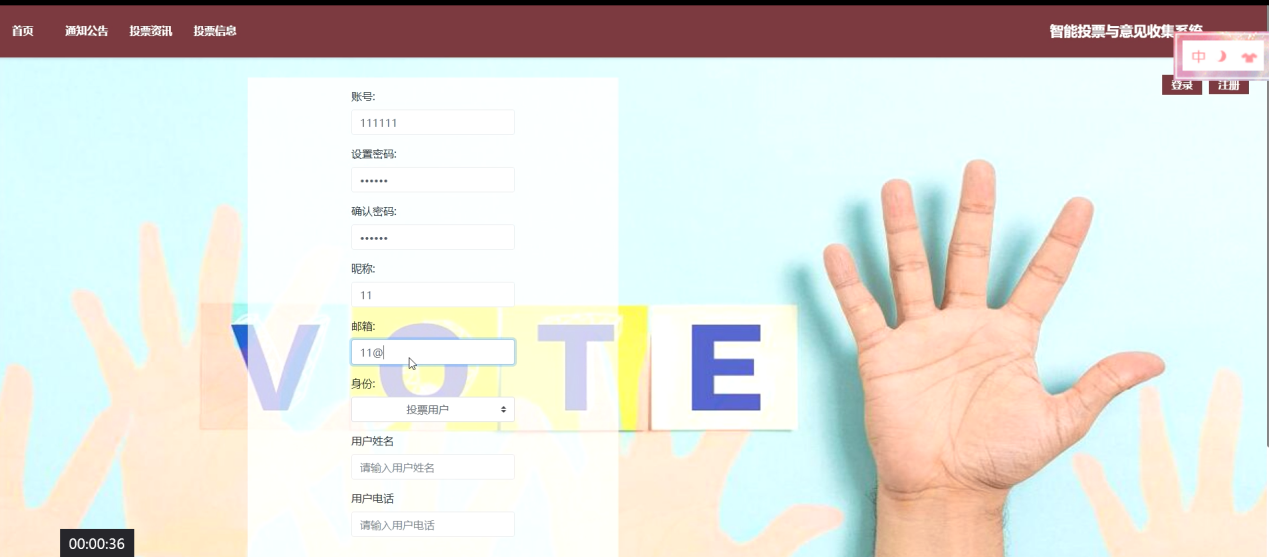 SSM智能投票与意见收集系统的操作流程简洁明了,分为用户。分析员和管理员两大角色。用户注册界面简洁,包含用户名、密码、手机号、邮箱等字段,系统验证信息后完成注册,确保数据准确性和完整性。其注册主界面展示如下图所示。