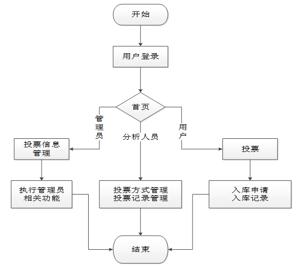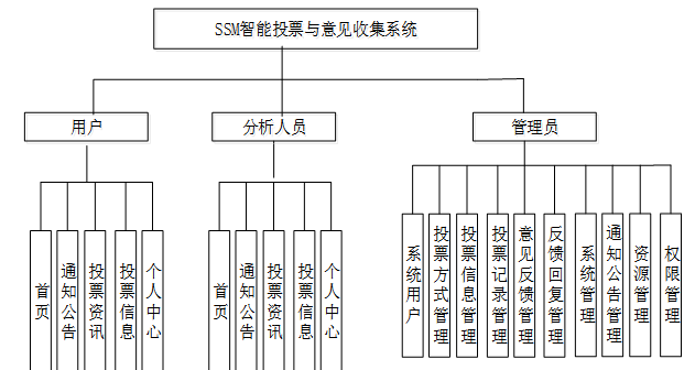 根据SSM框架下的智能投票与意见收集系统,系统功能根据不同角色划分为用户模块、分析人员和管理员模块三大模块。