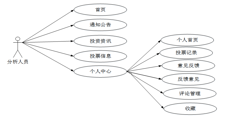 用户端包括首页展示通知公告、投票资讯和投票信息,个人中心则提供用户的投票记录、意见反馈、反馈回复、收藏与评论管理等功能,帮助用户更好地参与投票和管理自己的反馈信息。分析人员端功能与用户端类似,但在投票数据分析、统计和反馈处理上具有更多的权限,便于分析人员进行数据分析与总结。