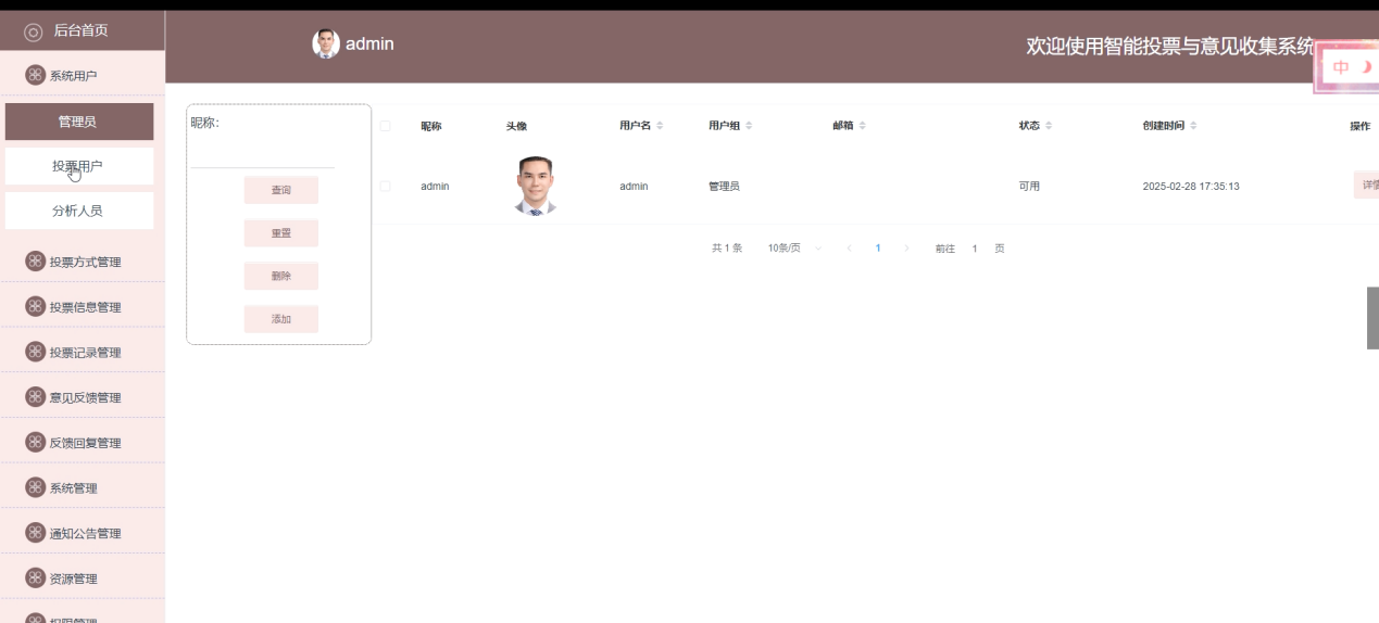 管理员首页界面提供了对系统的全面监控和管理入口,管理员可以快速访问用户管理、投票活动、公告发布及资源权限配置等核心功能。管理员首页界面展示如下图所示。