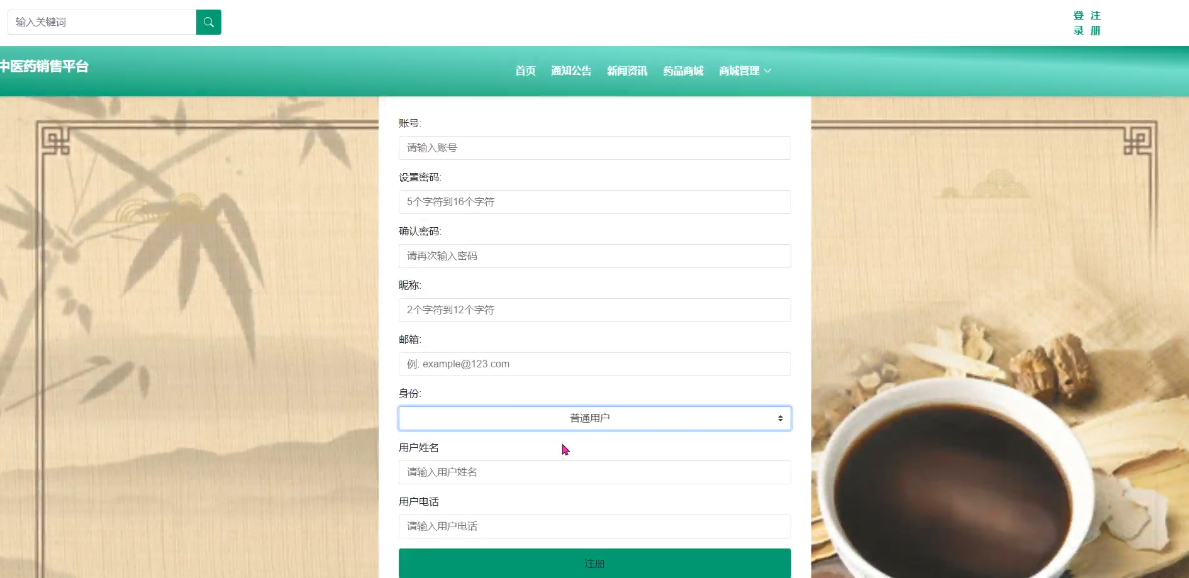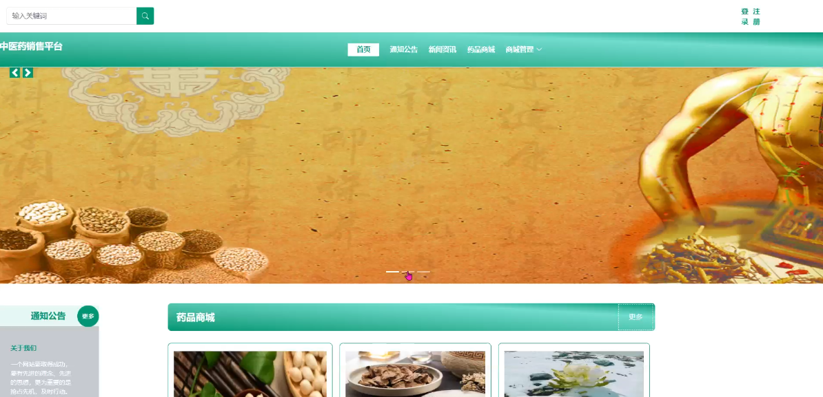 With the increasing global interest in traditional medicine, traditional Chinese medicine, as the crystallization of Eastern wisdom, has been widely recognized and applied worldwide. In this context, designing and implementing an efficient traditional Chinese medicine sales platform has significant practical significance. This project uses Java development language, MySQL database, and SpringBoot framework to create a comprehensive e-commerce platform that integrates information display and commodity trading through modern information technology. The platform not only provides a convenient way for ordinary users to purchase drugs, including core functions such as homepage browsing, notification and announcement reading, news and information acquisition, and drug mall shopping, but also specially sets up a personal center module for users to manage their shopping carts, orders, addresses, and personal information. At the same time, considering user experience, the platform supports users to perform operations such as data modification, password reset, and logging out, ensuring the security and personalized needs of the service. For administrators, the platform provides a series of backend management tools to ensure the stable operation and service quality of the system. This includes but is not limited to managing system users, updating carousel content, publishing and maintaining notifications and announcements, managing news and information classification, as well as critical mall management functions such as adjusting classification lists, processing orders, and tracking deliveries. Through these measures, not only can the market coverage of traditional Chinese medicine products be effectively improved, but also the inheritance and development of traditional Chinese medicine culture can be further promoted.