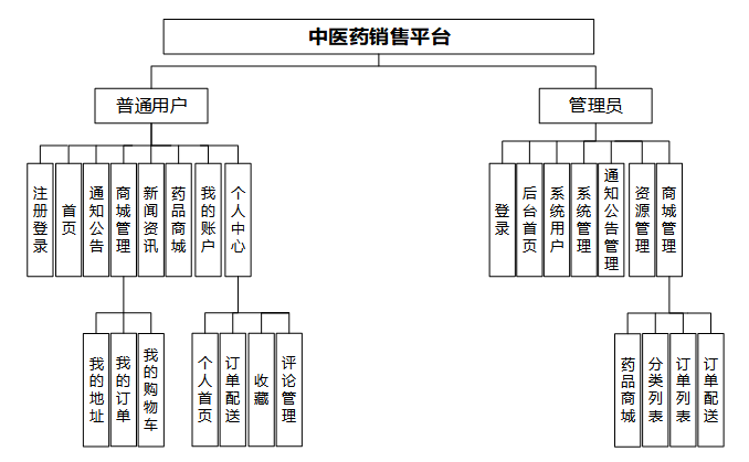 在上一章节中主要对系统的功能性需求和非功能性需求进行分析,并且根据需求分析了本中医药销售平台中的用例。那么接下来就要开始对本中医药销售平台的架构、主要功能和数据库开始进行设计。中医药销售平台根据前面章节的需求分析得出,中医药销售平台的功能模块图如下图所示。