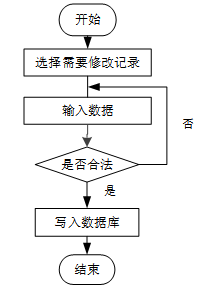 用户首先选择需要修改的记录,输入修改后的数据,系统判断输入数据是否合法。若数据不合法,提示重新输入,若数据合法,则将修改后的数据写入数据库,完成操作后流程结束。修改信息流程图如下图所示。