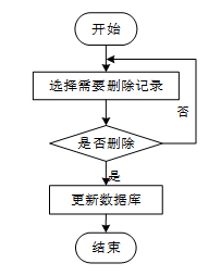 用户选择需要删除的记录后,系统判断是否确认删除。若未确认,返回选择环节,若确认删除,则更新数据库,删除对应记录,完成操作后流程结束。删除信息流程图如下图所示。