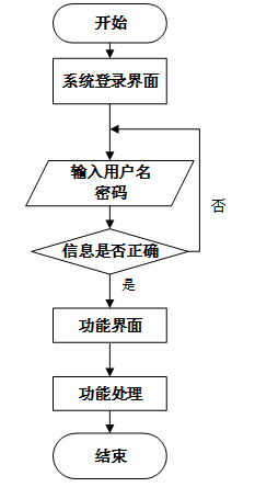 用户首先进入系统登录界面,输入用户名和密码后,系统验证信息是否正确。若验证失败,返回登录界面重新输入,若验证成功,则进入功能界面,执行相应功能处理后结束操作流程。操作流程如下图所示。