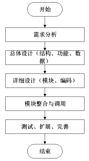 系统开发流程的主要步骤,从需求分析到系统完成的全过程。流程包括需求分析、总体设计(结构、功能、数据)、详细设计(模块、编码)、模块整合与调用,以及测试、扩展和完善,最终完成系统的开发。本系统的开发流程如下图所示