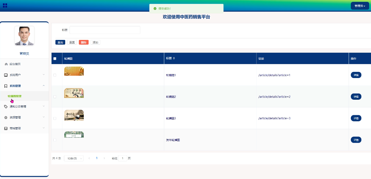 - 系统管理:系统管理模块提供了轮播图的添加、删除和查询。管理员可以上传新的轮播图来吸引用户注意特定的活动或重要信息,并且可以轻松地更新或移除不再需要的轮播图。