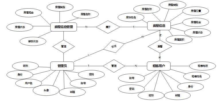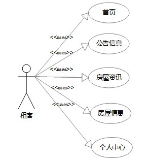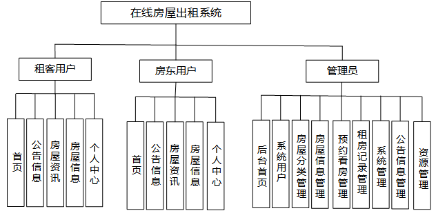 三、功能模块设计:系统包含三个主要用户角色:租客用户、房东用户和管理员。租客用户能够在首页浏览公告信息、房屋资讯和房屋信息,通过个人中心查看个人首页、进行预约看房、管理租房记录和收藏心仪房屋。房东用户在首页可获取公告信息和房屋资讯,查看房屋信息并在个人中心管理个人首页、处理预约看房请求、管理房屋信息、查看租房记录、进行评论管理和收藏相关内容。管理员通过后台首页进行系统管理,包括对系统用户的管理、房屋分类管理、房屋信息管理、预约看房管理、租房记录管理、系统管理中的轮播图管理、公告信息管理以及资源管理中的房屋资讯和资讯分类管理,为各方用户提供全面的房屋出租管理平台。
