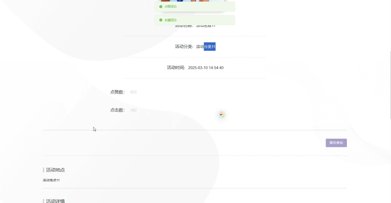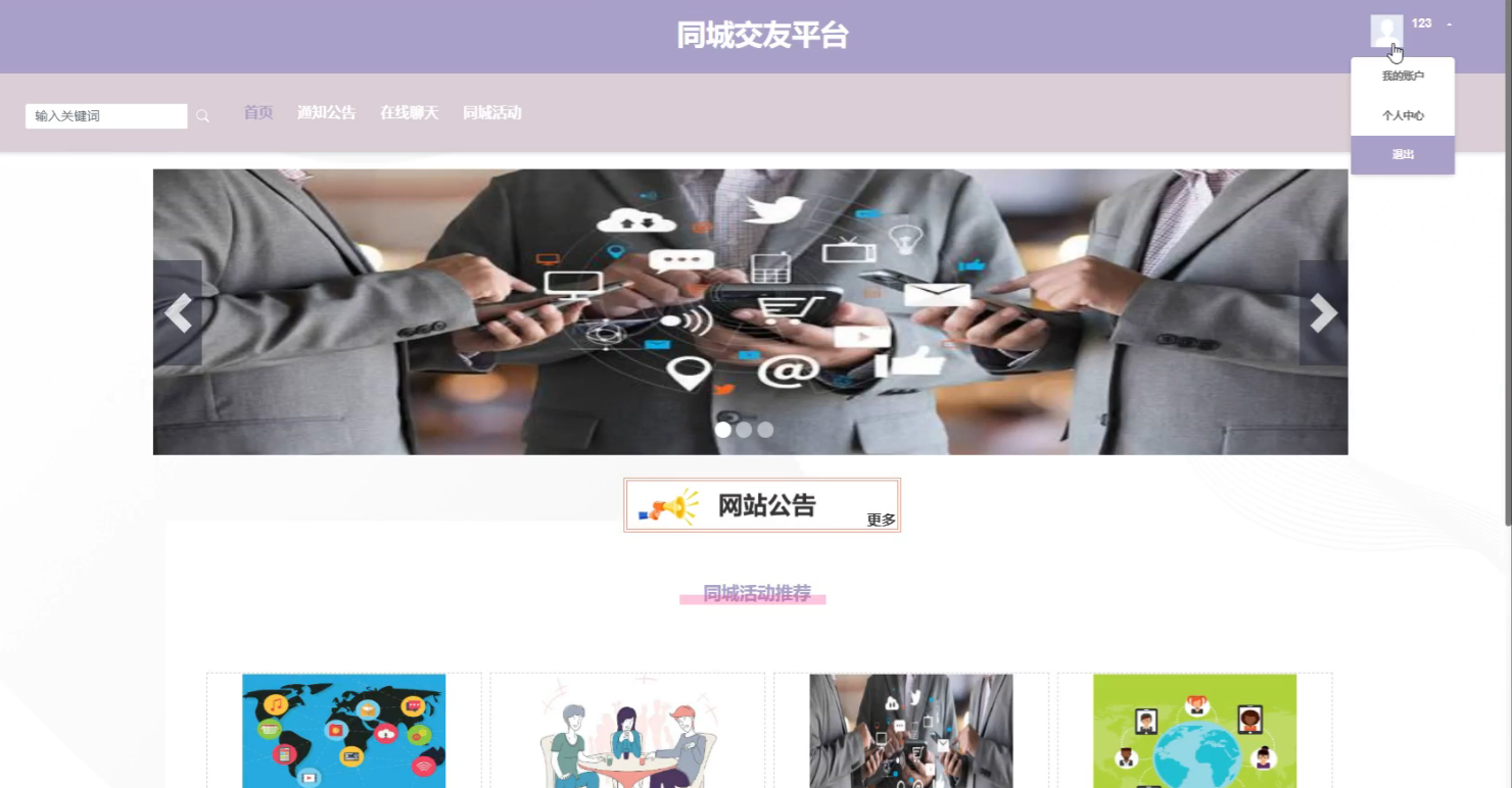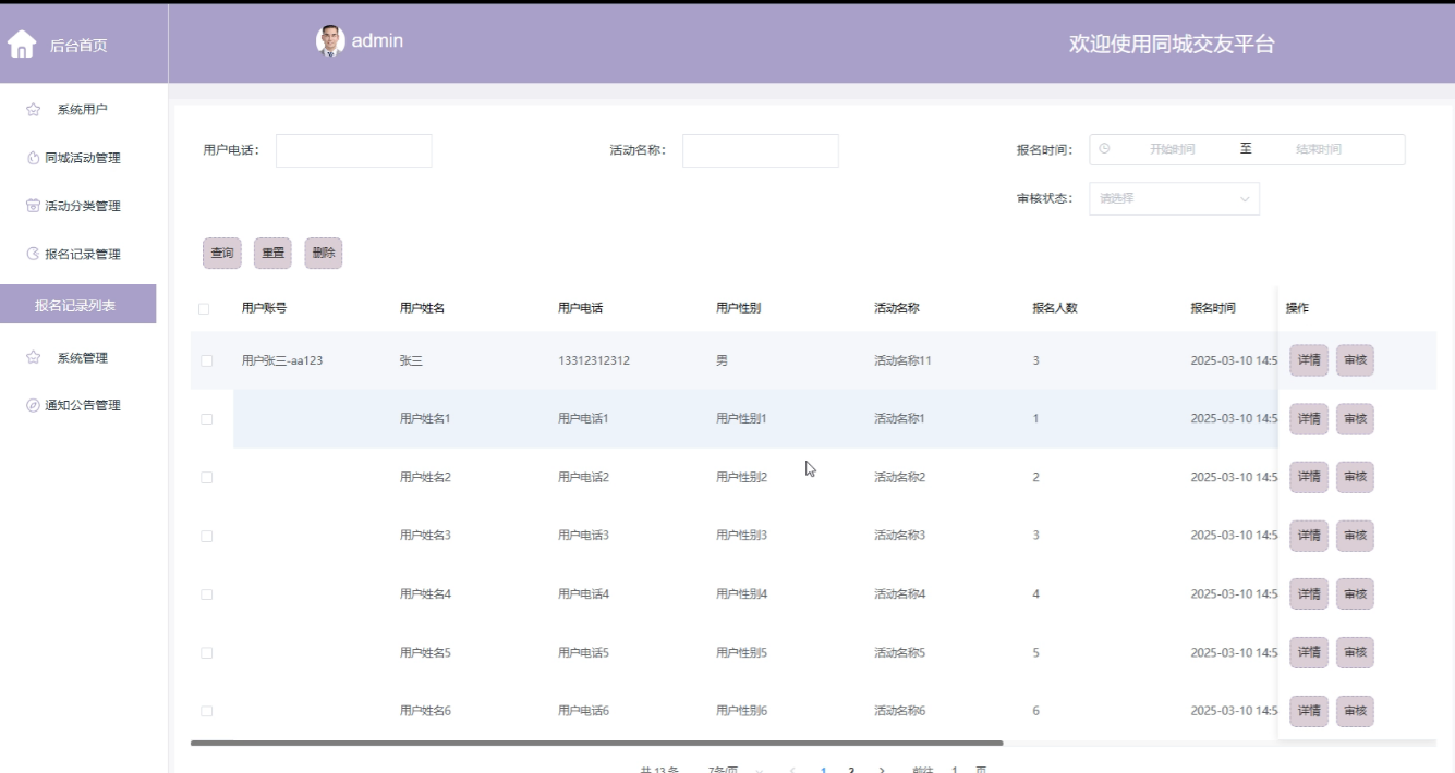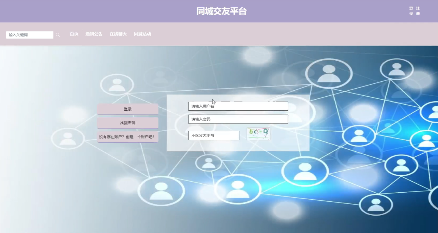 The intra-city dating platform based on SSM architecture aims to promote social interaction between users through Internet technology, especially if geographically close users can find like-minded friends more easily. The platform not only provides basic functions such as registration and login and personal data management, but also particularly emphasizes on the recommendation and management of intra-city activities, and intelligently pushes relevant activity information according to users' interests and behavior habits, so as to improve user experience. Security and privacy protection are taken into account in the system design to ensure that users' personal information is properly protected while enjoying the service. The administrator background provides comprehensive activity management and system maintenance tools to ensure the stable operation and content quality of the platform.