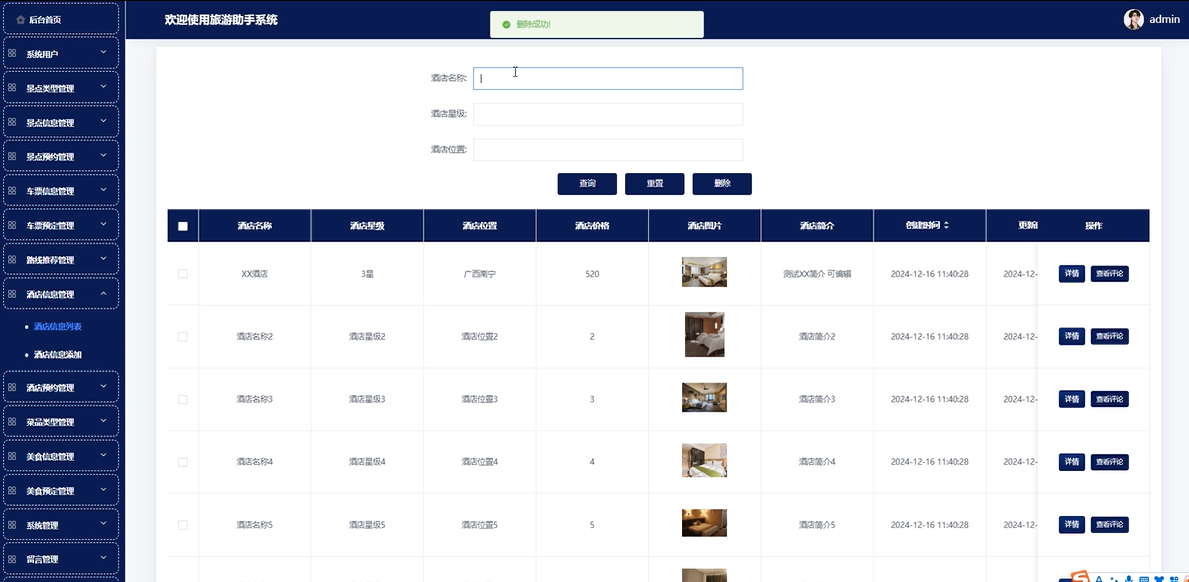 管理员可对所有酒店信息进行管理和查看其信息详情,进行查询和删除操作。酒店信息管理界面布局如下图: