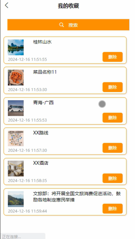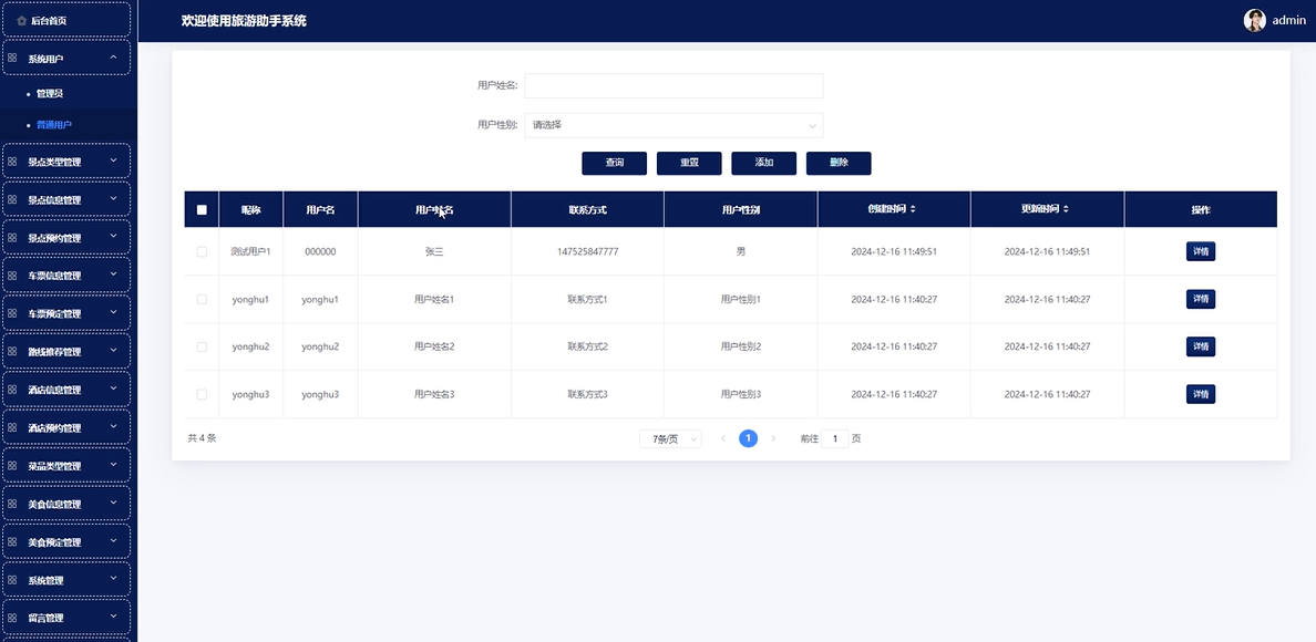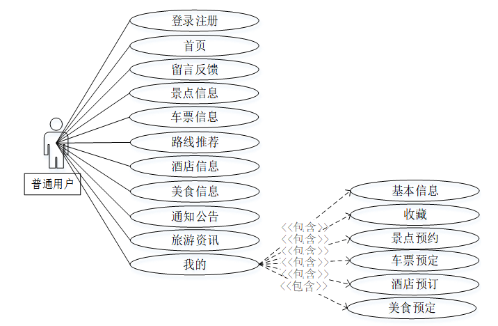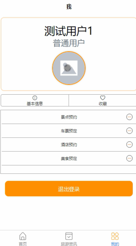 普通用户可对基本信息、收藏、景点预约、车票预定、酒店预订、美食预定等信息进行管控和查阅信息详情。例如,可在个人首页修改个人资料;可查看和删除自己收藏的信息等。