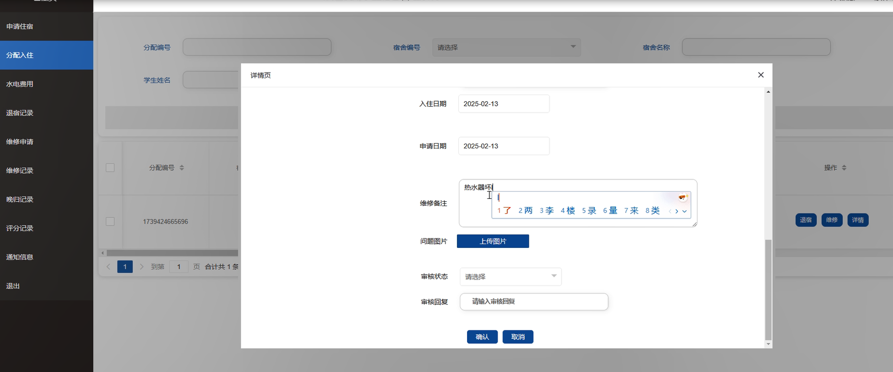 维修申请:学生可以维修进行申请,包括维修申请时间、宿舍号、问题图片、维修描述等信息,提交后等待管理员审核。