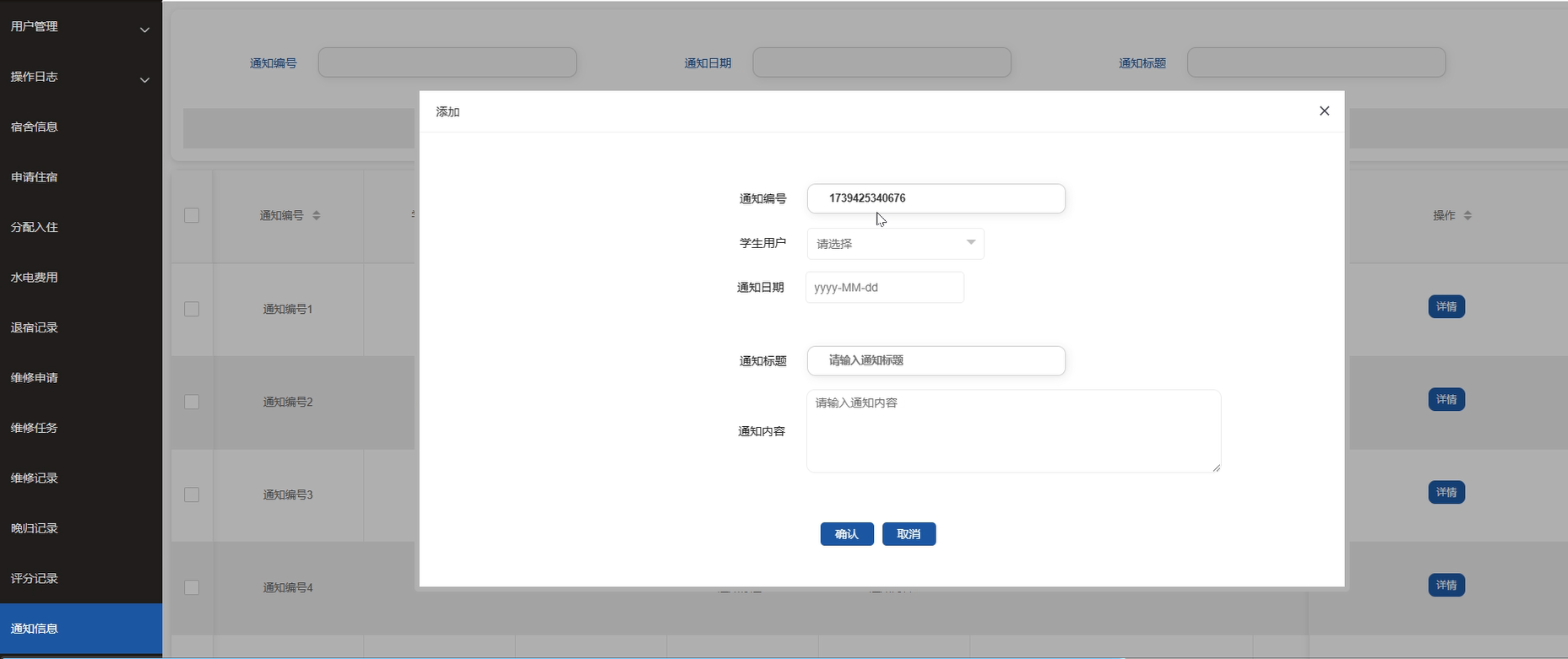 宿舍信息:管理添加所有宿舍信息详情,可以进行增删改查的操作。