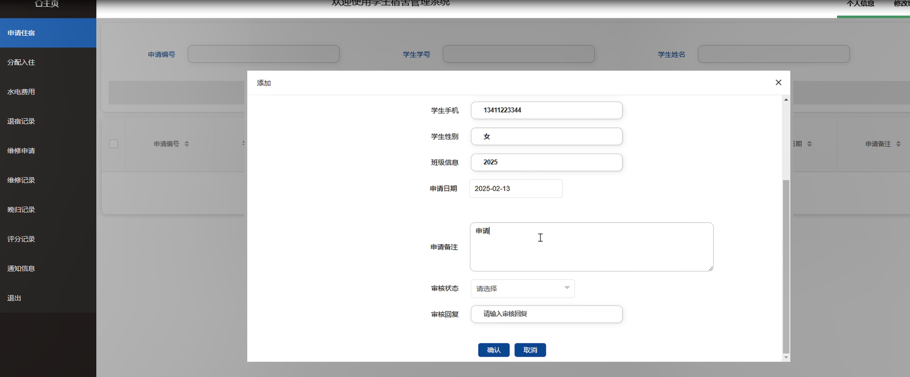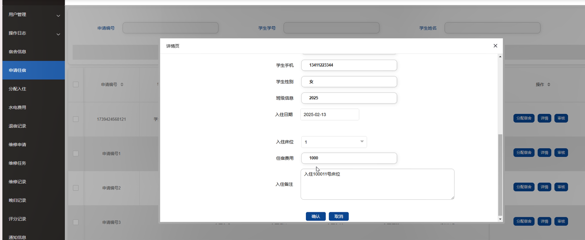 申请住宿:审核学生入住的申请信息,管理学生的宿舍入住情况。