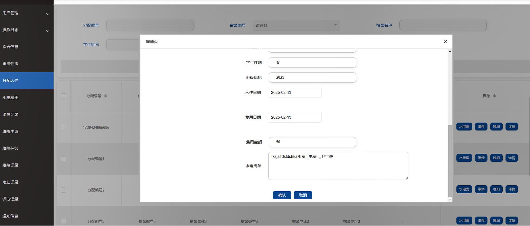 分配入住:分配宿舍信息,包括宿舍编号、类型、电话、宿舍地址、学生用户姓名、学号、金额等信息。