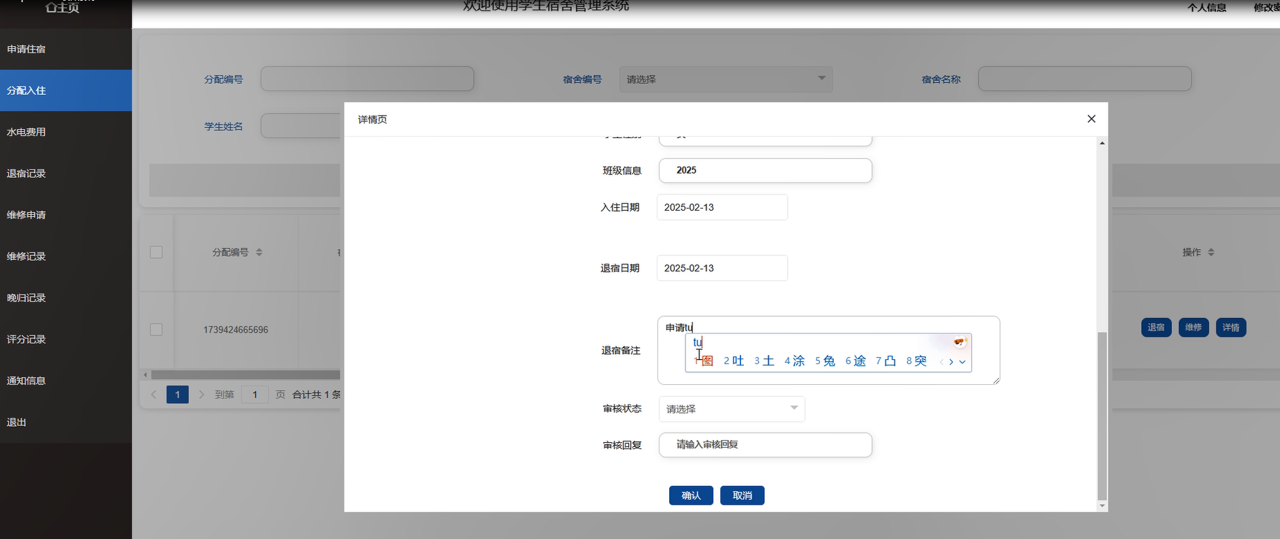 分配入住:管理员通过审核后查看分配入住宿舍信息。