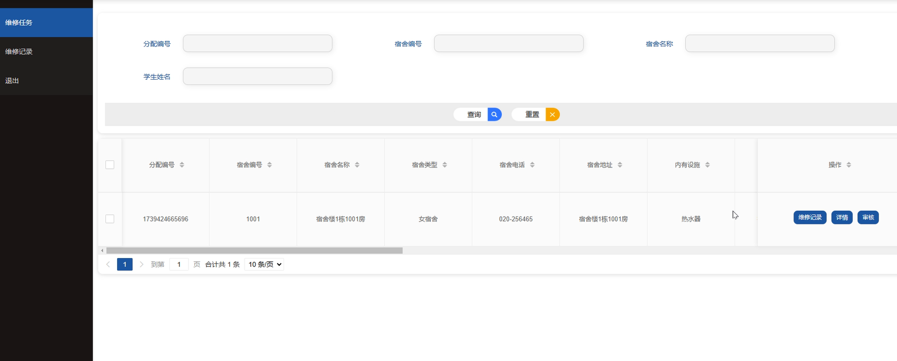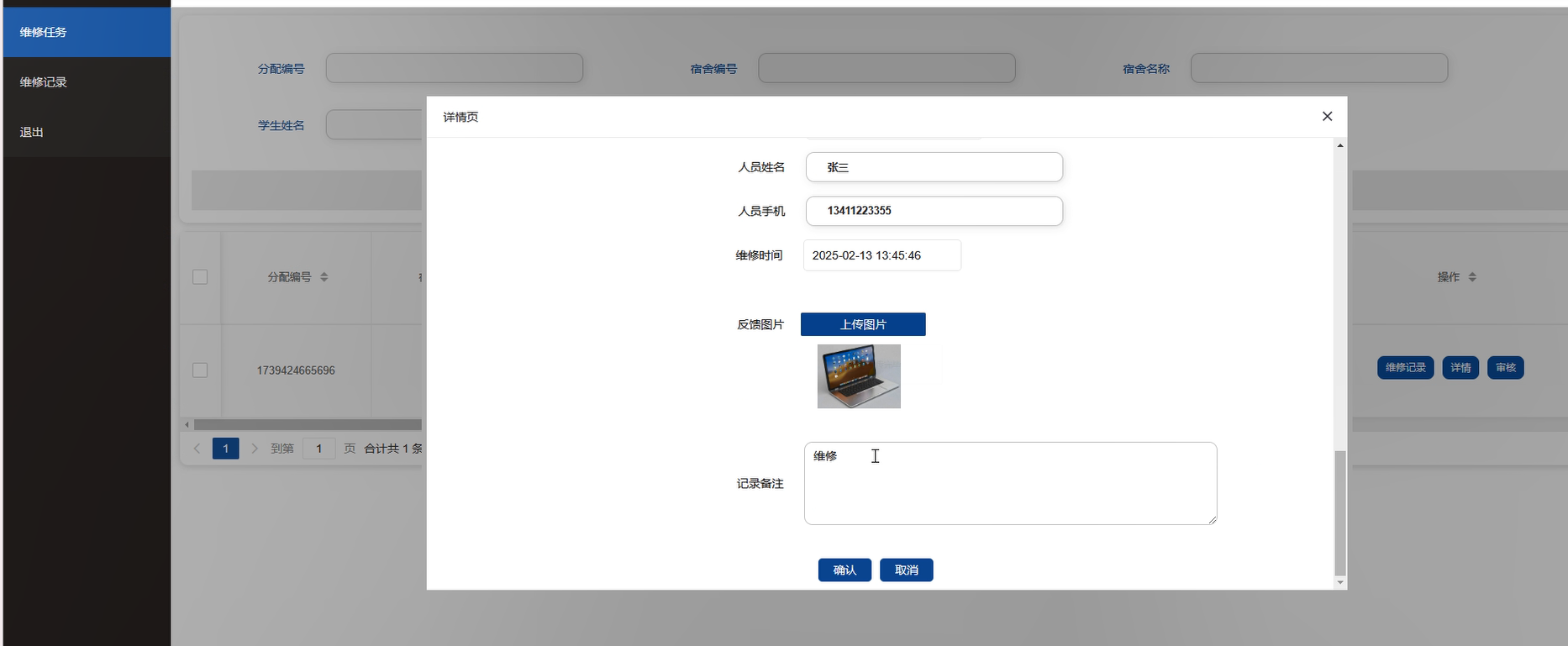 维修任务:维护人员可以查看所有维修任务,进行任务分配和状态更新,及时处理宿舍内设施的故障。