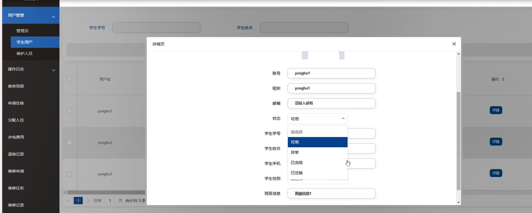 学生宿舍管理系统中的管理人员是可以对注册的学生用户和维修用户进行管理的,包括对用户信息进行增删改查等操作,也可以对管理员进行管控。界面如下图5-6所示。