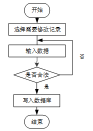 用户首先选择需要修改的记录,输入修改后的数据,系统判断输入数据是否合法。若数据不合法,提示重新输入,若数据合法,则将修改后的数据写入数据库,完成操作后流程结束。修改信息流程图如下图所示。