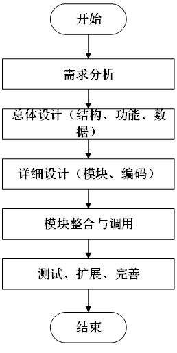 系统开发流程的主要步骤,从需求分析到系统完成的全过程。流程包括需求分析、总体设计(结构、功能、数据)、详细设计(模块、编码)、模块整合与调用,以及测试、扩展和完善,最终完成系统的开发。本系统的开发流程如下图所示
