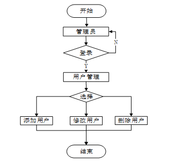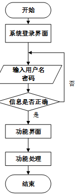用户首先进入系统登录界面,输入用户名和密码后,系统验证信息是否正确。若验证失败,返回登录界面重新输入,若验证成功,则进入功能界面,执行相应功能处理后结束操作流程。操作流程如下图所示。