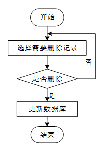 用户选择需要删除的记录后,系统判断是否确认删除。若未确认,返回选择环节,若确认删除,则更新数据库,删除对应记录,完成操作后流程结束。删除信息流程图如下图所示。