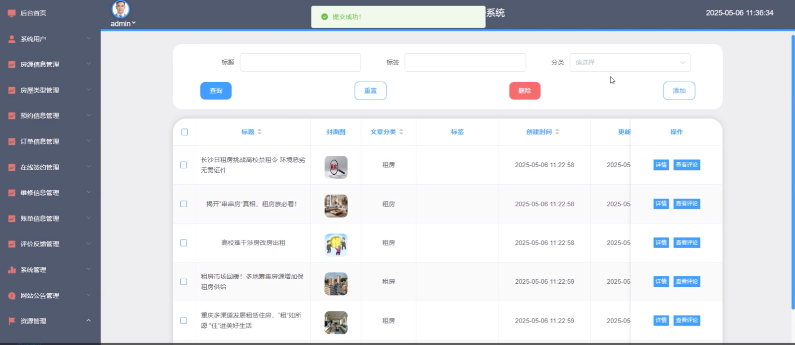 资源管理:管理员可以管理平台资讯,分类资讯信息,并查看评论。