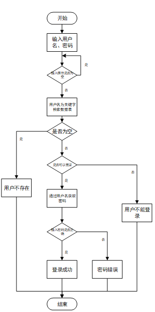 用户输入用户名和密码后,系统先检查输入是否为空,再验证用户名是否存在,若存在则通过用户名获取密码并校验。若密码正确则登录成功,否则提示密码错误。若用户名不存在或无法登录,提示用户操作无效。如下图所示。