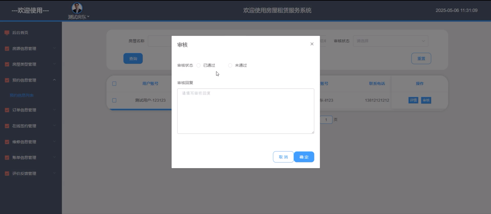 预约信息管理:房东可以查看用户的预约信息,并进行审核和回复。