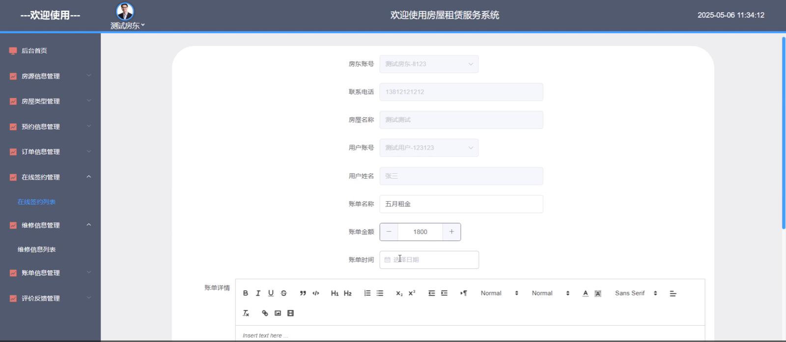 账单信息管理:房东可以向用户发送账单信息,包括租金、金额、时间等内容。