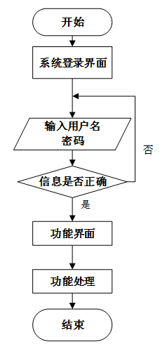 用户首先进入系统登录界面,输入用户名和密码后,系统验证信息是否正确。若验证失败,返回登录界面重新输入;若验证成功,则进入功能界面,执行相应功能处理后结束操作流程。操作流程如图3-5所示。