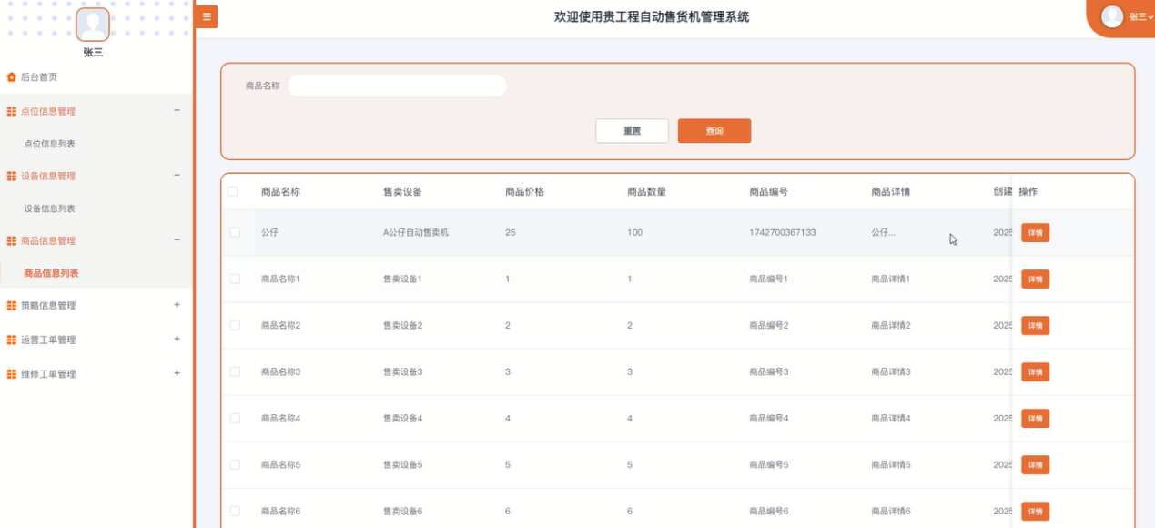 用户进入商品操作页面,选择需要操作的商品,商品名称、售卖设备、商品规格、商品数量、重置、查询等操作。界面如图5-2所示。
