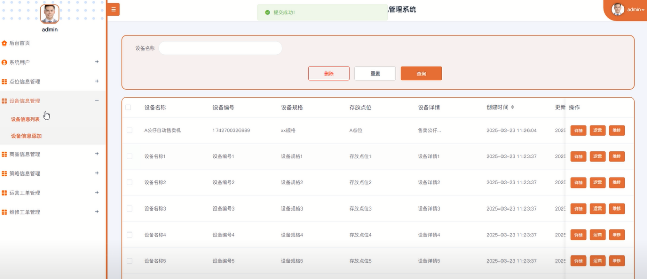 管理员进入设备信息管理页面,查看所有设备的详细资料,包括设备名称、型号、规格、存放点位等。管理员可新增、编辑或删除设备信息,确保设备管理数据的准确与更新,便于后续操作与维护。界面如图5-7所示。