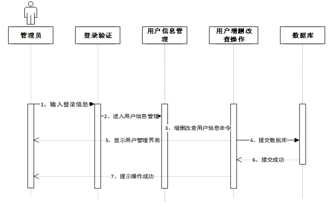 管理员输入登录信息后,进入用户信息管理模块,选择增删改查操作并提交命令至数据库。数据库执行操作后返回成功状态,系统显示用户管理界面并提示操作成功。管理员修改用户信息时序图如图4-5所示。