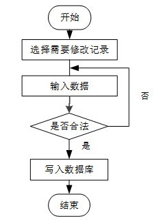 用户首先选择需要修改的记录,输入修改后的数据,系统判断输入数据是否合法。若数据不合法,提示重新输入;若数据合法,则将修改后的数据写入数据库,完成操作后流程结束。修改信息流程图如图3-7所示。