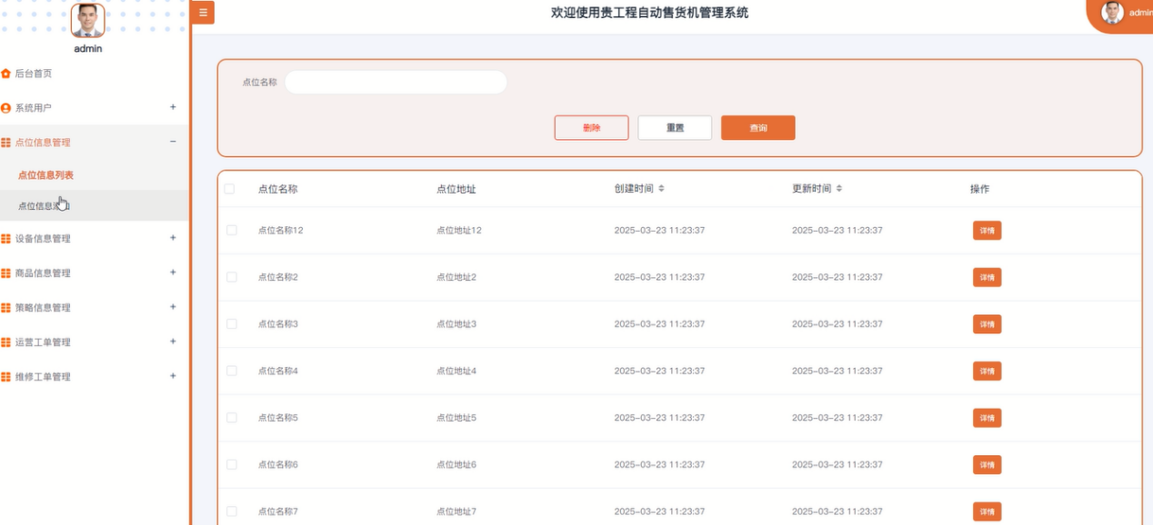 管理员登录后台进入点位信息页面,查看点位名称、点位地址等。,包括查看、重置、删除等操作。界面如图5-6所示。