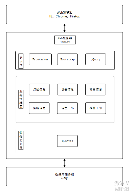 系统由表现层、业务逻辑层、数据访问层和数据库服务器组成。表现层通过浏览器(如IE、Chrome、Firefox)与用户交互,采用FreeMarker、Bootstrap、jQuery等技术实现界面呈现。业务逻辑层负责处理系统的核心业务逻辑,通过分模块设计实现功能分离。数据访问层使用MyBatis框架连接数据库,执行数据的增删改查操作。数据库服务器采用MySQL进行数据存储和管理,为系统提供稳定的数据库支持。整个架构通过Tomcat服务器完成用户请求的接收和处理,确保系统的高效运行[8]。整个系统架构如图4-1所示。