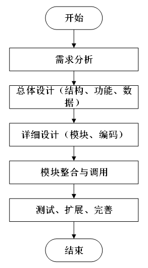 系统开发流程的主要步骤,从需求分析到系统完成的全过程。流程包括需求分析、总体设计(结构、功能、数据)、详细设计(模块、编码)、模块整合与调用,以及测试、扩展和完善,最终完成系统的开发。本系统的开发流程如图3-3所示