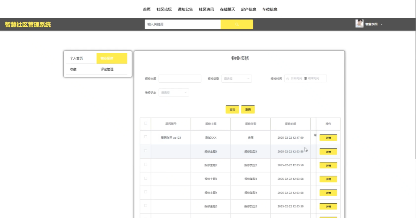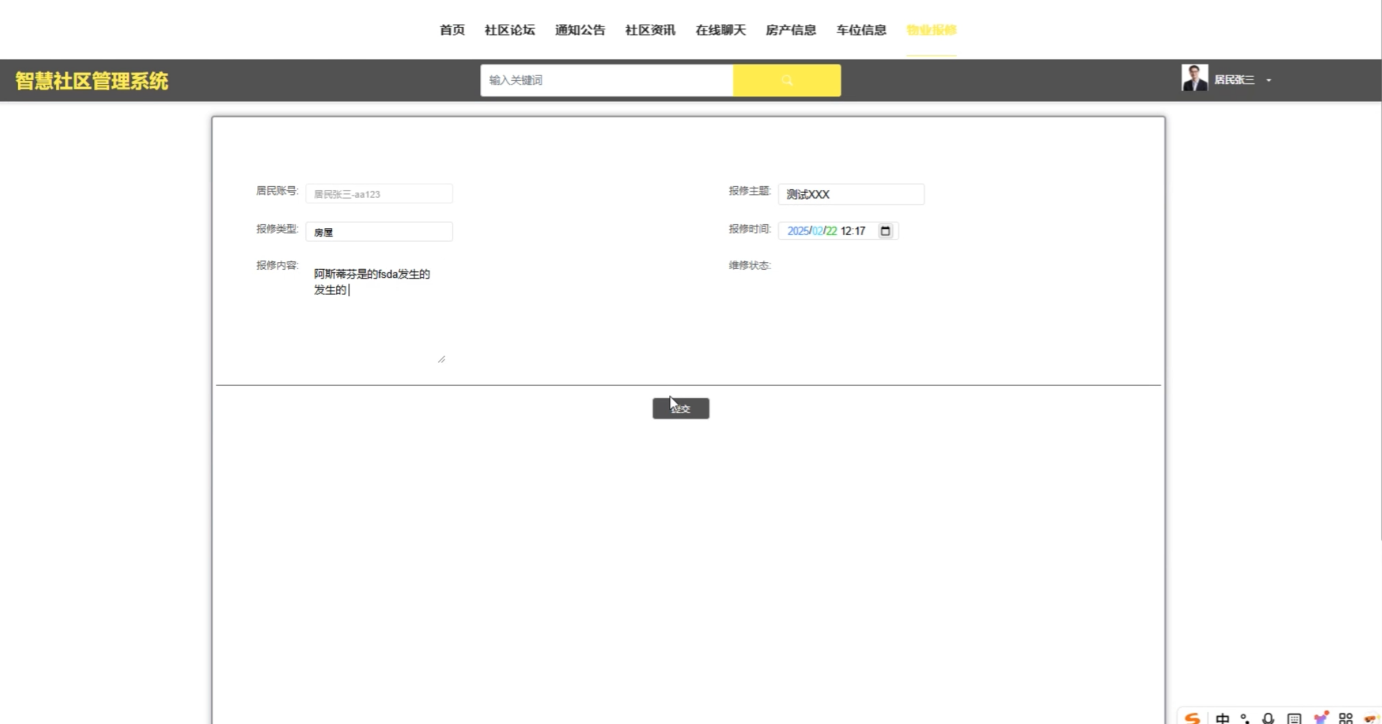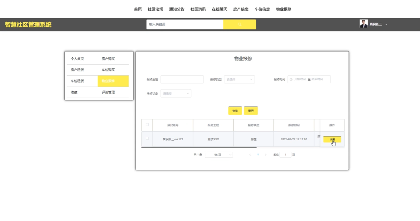 物业报修模块为居民提供了便捷的维修申请渠道。用户需填写报修主题、类型、时间及具体描述,并可上传图片辅助说明问题。提交后,系统生成报修工单并分配给物业人员处理。用户可在个人中心实时跟踪维修进度,查看当前状态。物业用户则负责接收报修请求、分配任务及更新维修结果,确保问题高效解决。物业报修界面如下图5-15所示。