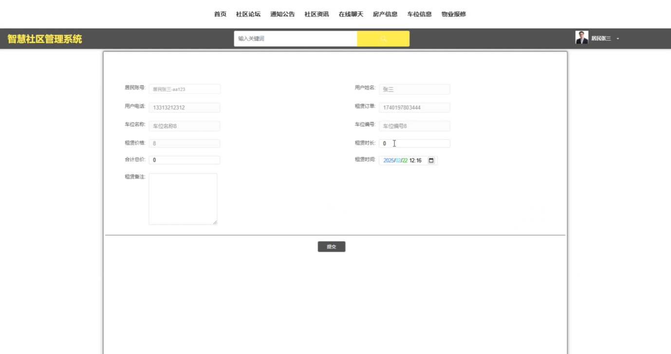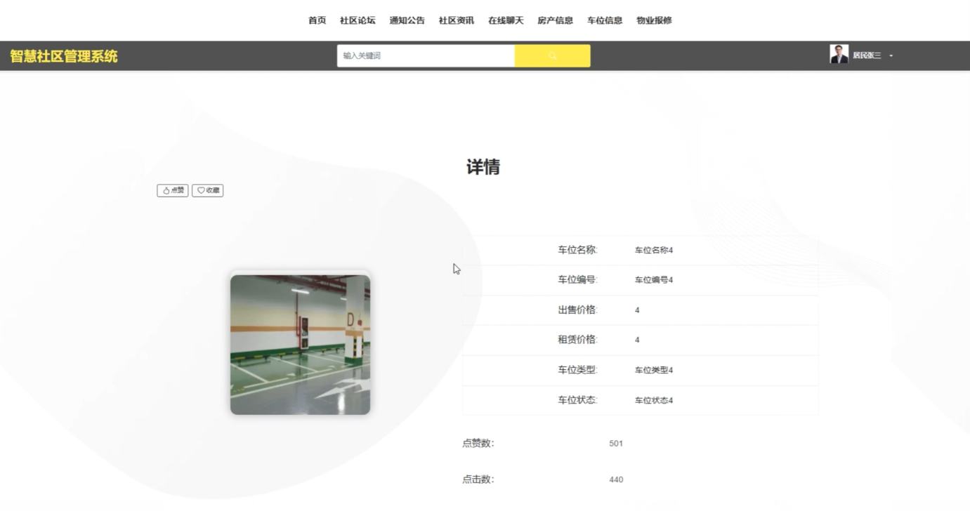 车位信息:查询车位状态、价格及类型,为居民提供车位租赁或购买服务。