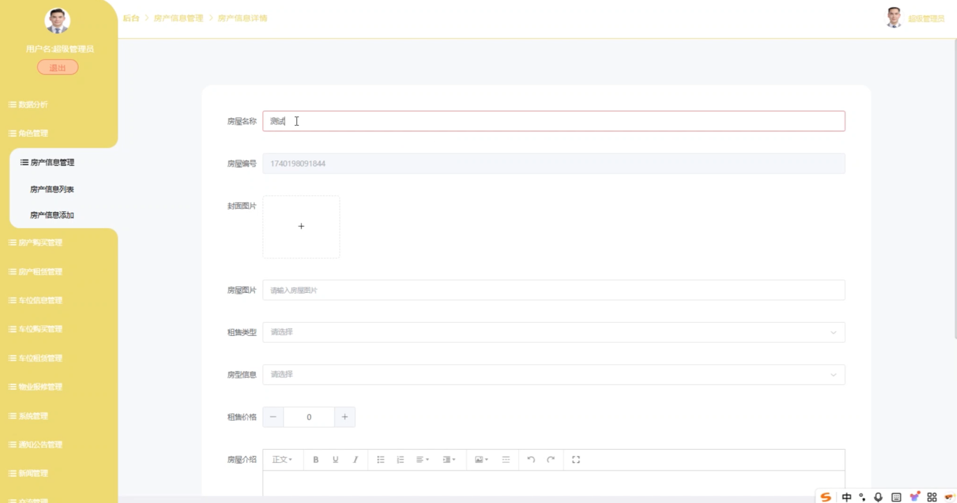 房产信息管理:增删改查房屋信息,包括名称、编号、图片、租售类型等。