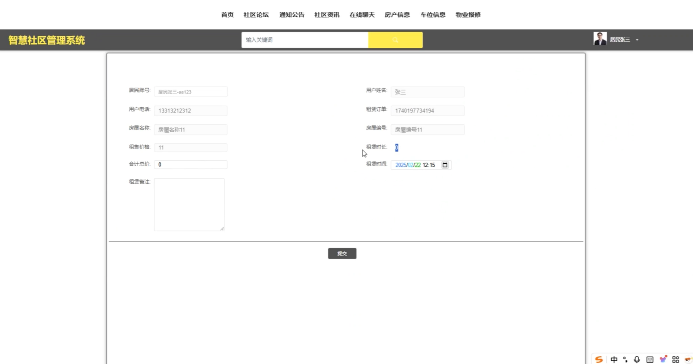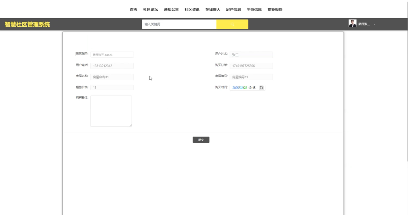 系统采用前后端分离架构,前端基于Vue.js框架实现用户界面交互,后端采用Spring Boot作为核心开发框架,结合MySQL数据库进行数据存储与管理。系统主要实现了房产信息管理、车位租赁与购买、物业报修、社区论坛、通知公告等功能模块,通过构建一个功能全面、操作便捷且安全可靠的智慧社区管理平台,满足居民、物业和管理员多方需求。此外,系统还引入了角色权限管理机制,确保不同用户角色的操作权限清晰明确。